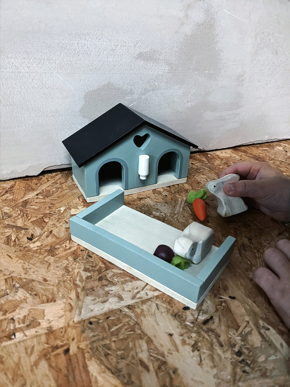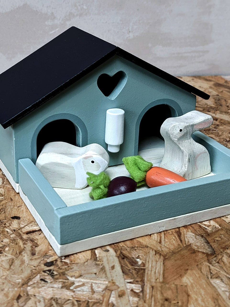 Great for small world play, this wooden rabbit and guinea pig hutch comes complete with water bottle, carrot and turnip for endless imaginative play!