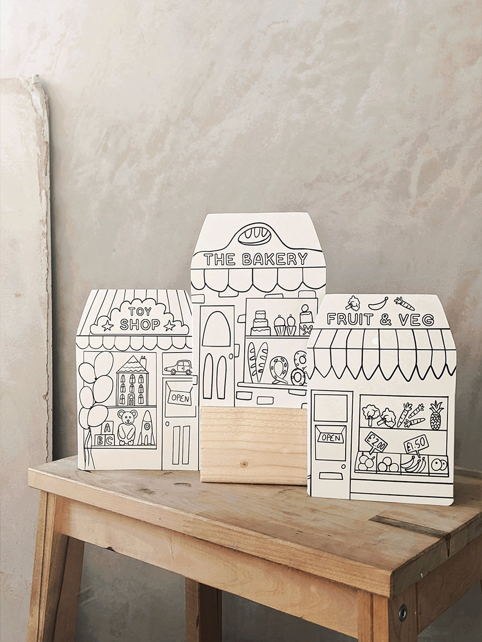 Colour your very own set of folding high street shops, then stand them up into a play scene for hours of imaginative play. This set has been designed as a colouring craft activity, but also as a celebration of the high street & all it brings us.