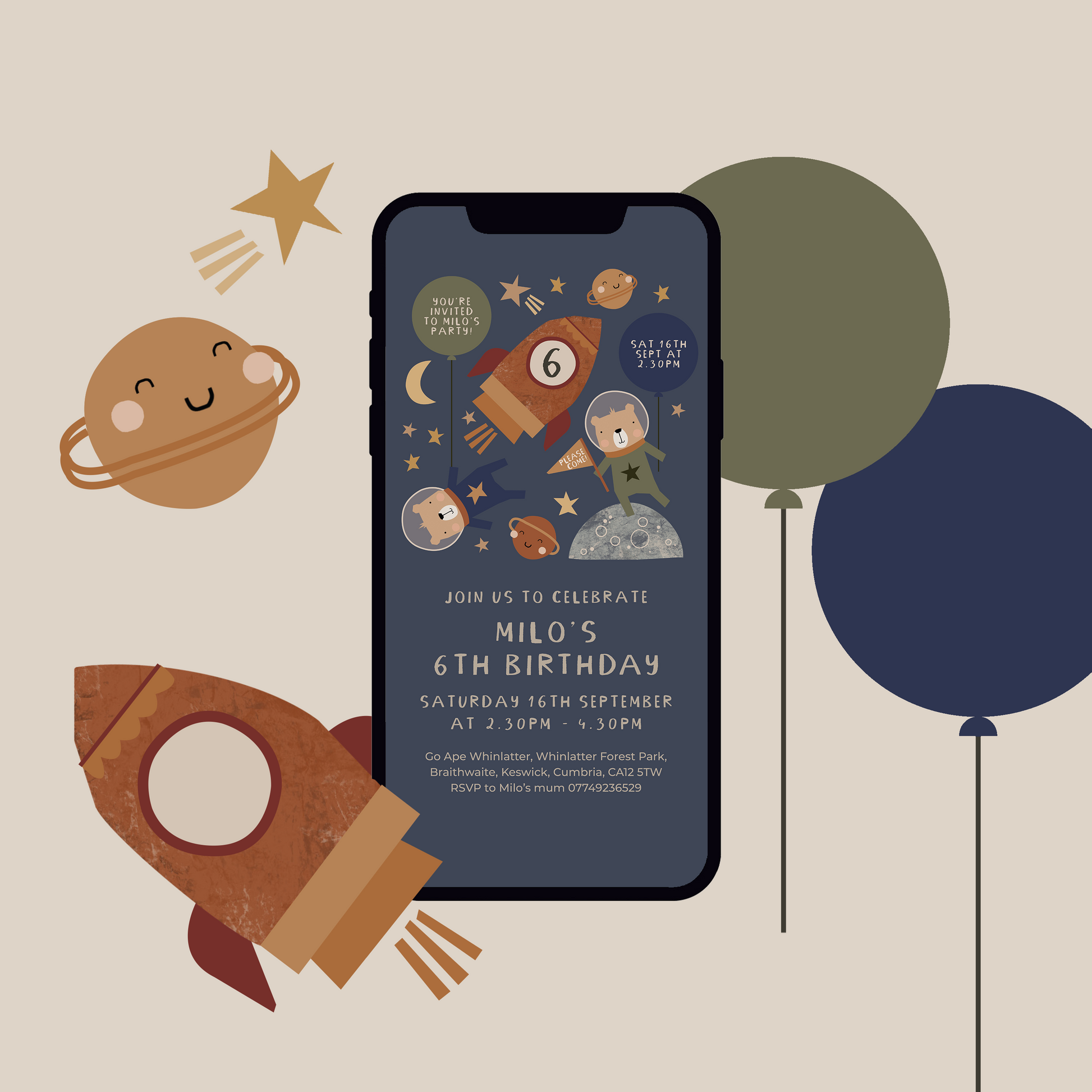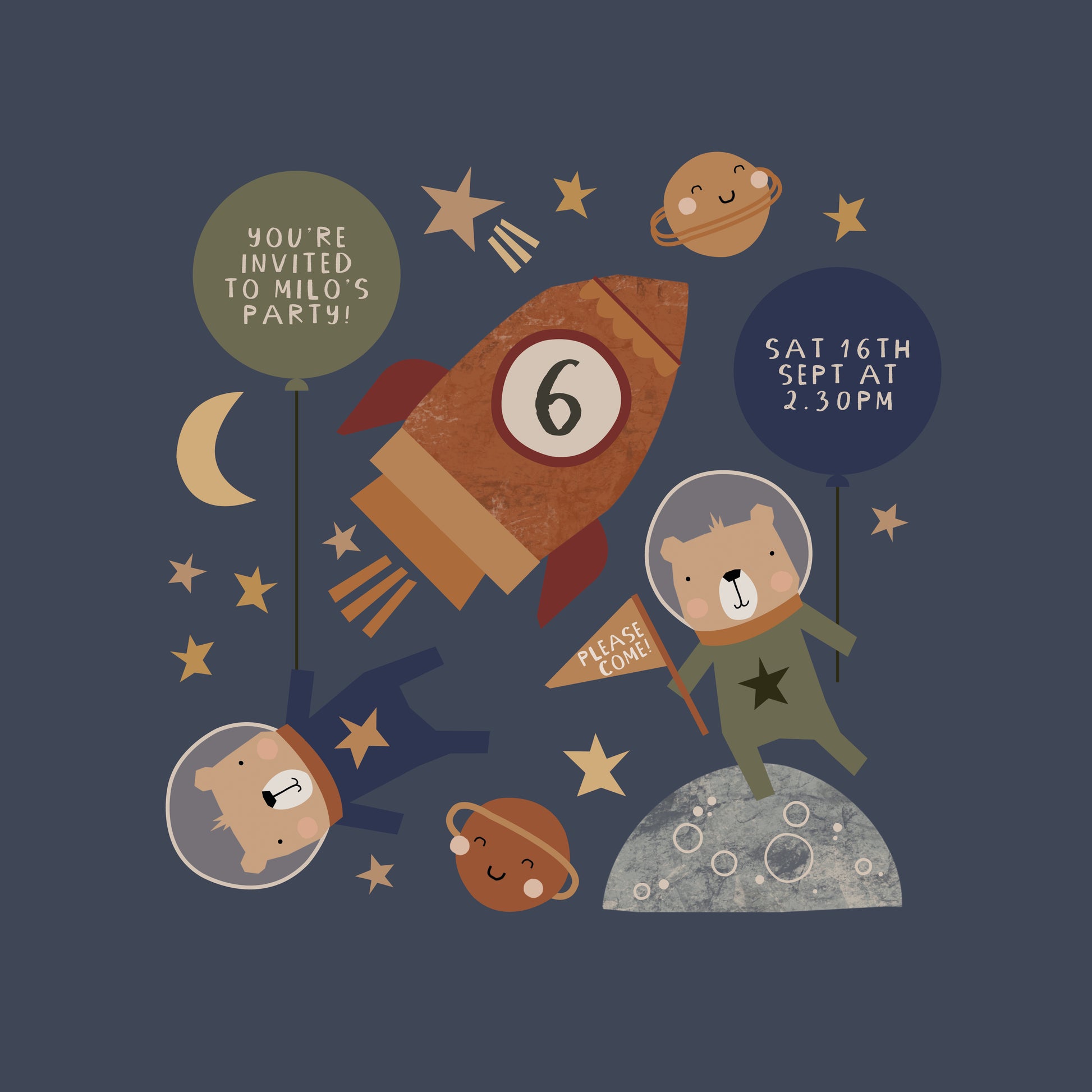 Personalise your little ones birthday party invite with our digital space invitation. Our outer space rocket illustrations are ready for a party and can't wait to share the special event details with your family and friends! More designs are available.