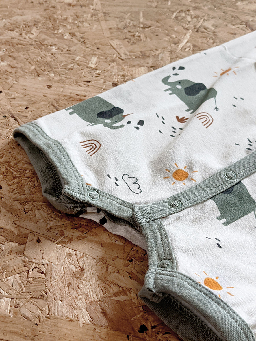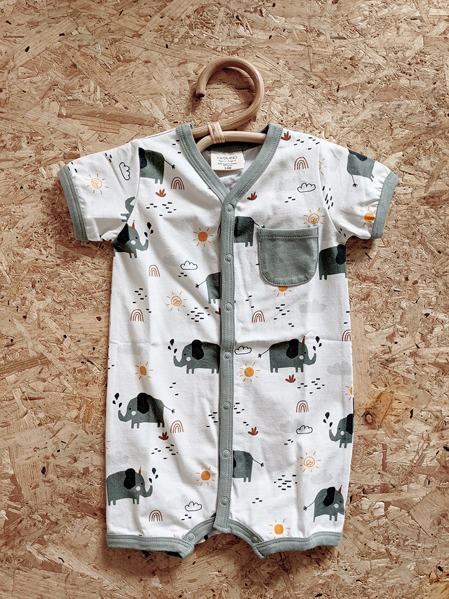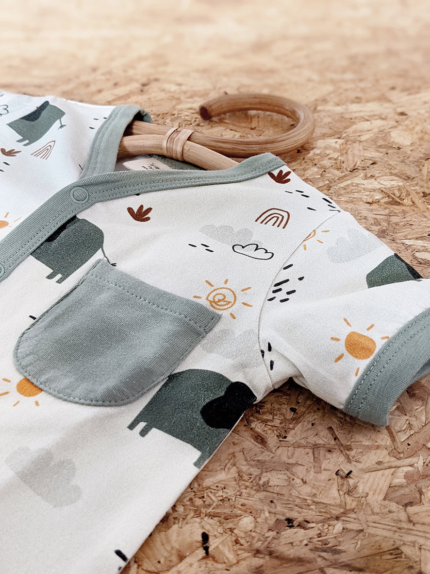 The softest organic fabric romper with our elephant design and contrasting front pocket, with popper closures to make those night time changes just that little bit easier!