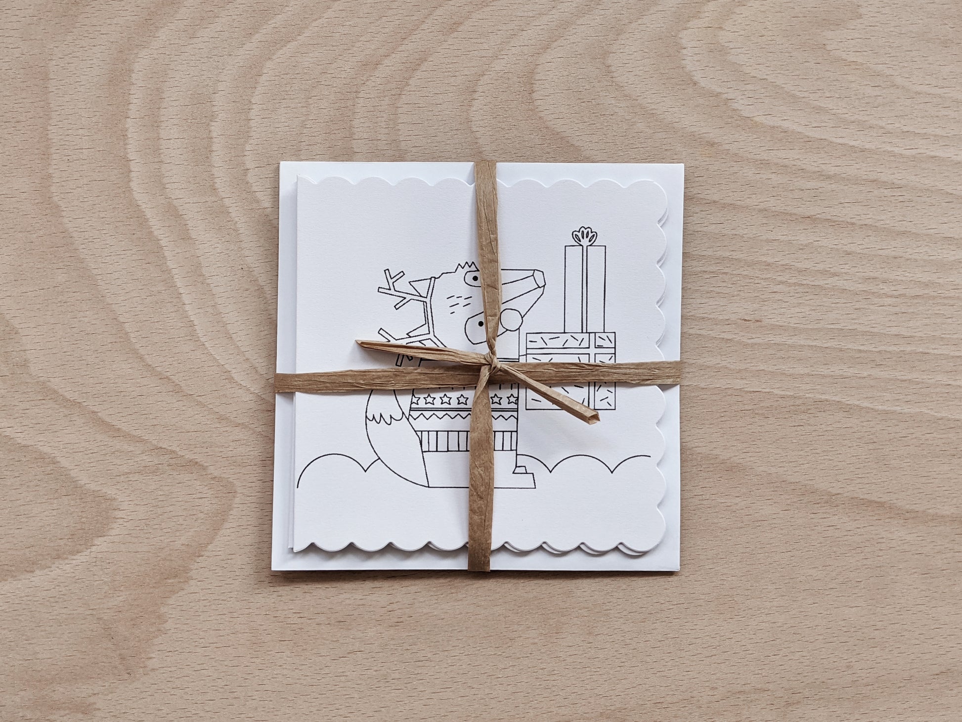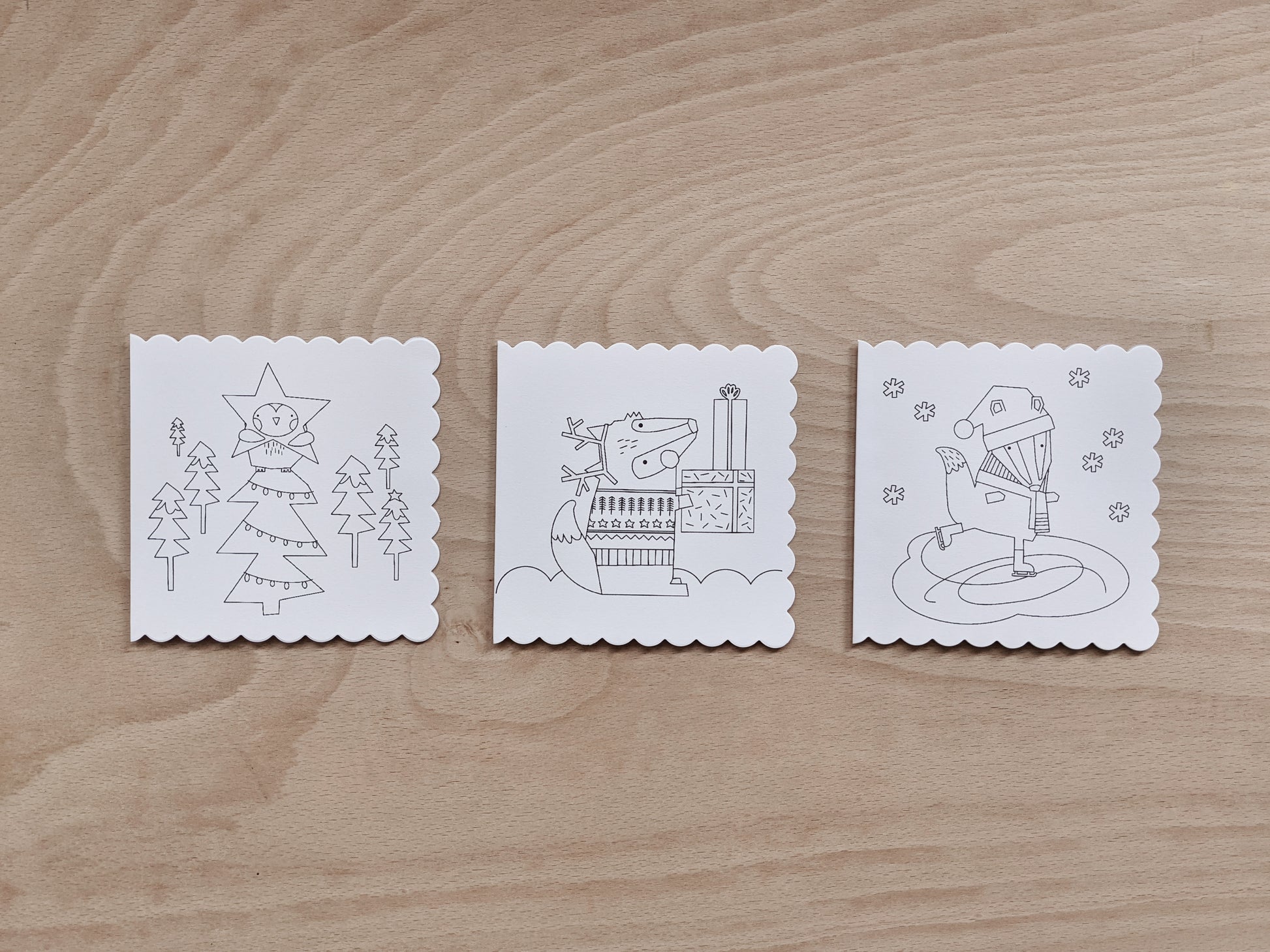 - Whats included: 3 x Christmas cards to colour in (3 different designs - fox with presents, forest of trees, badger ice skating), 3 x white envelopes, blank inside for your own message