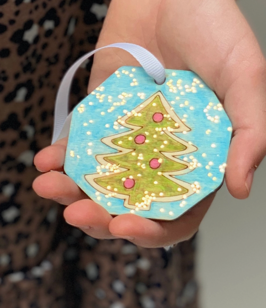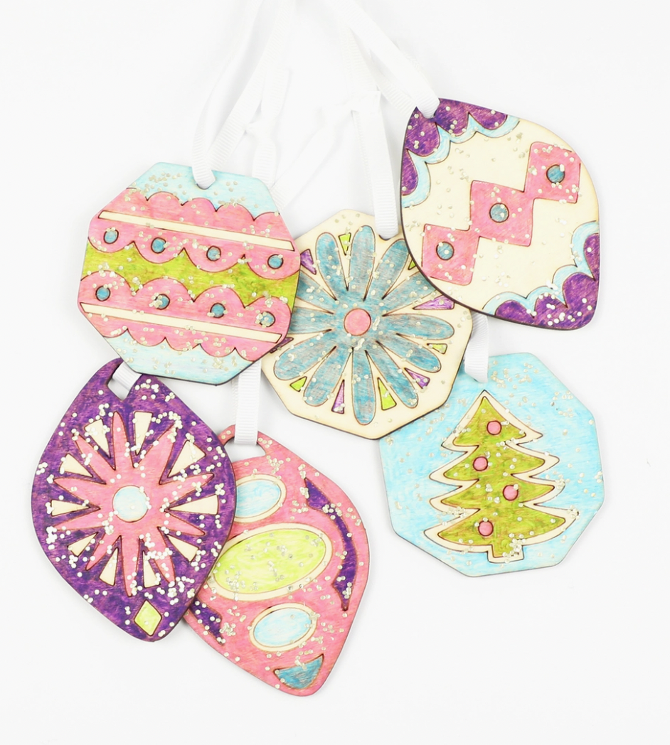- Whats included: 6 x plywood decorations, ribbon, jumbo watercolour pencils, jumbo sharpener, paintbrush, eco glitter