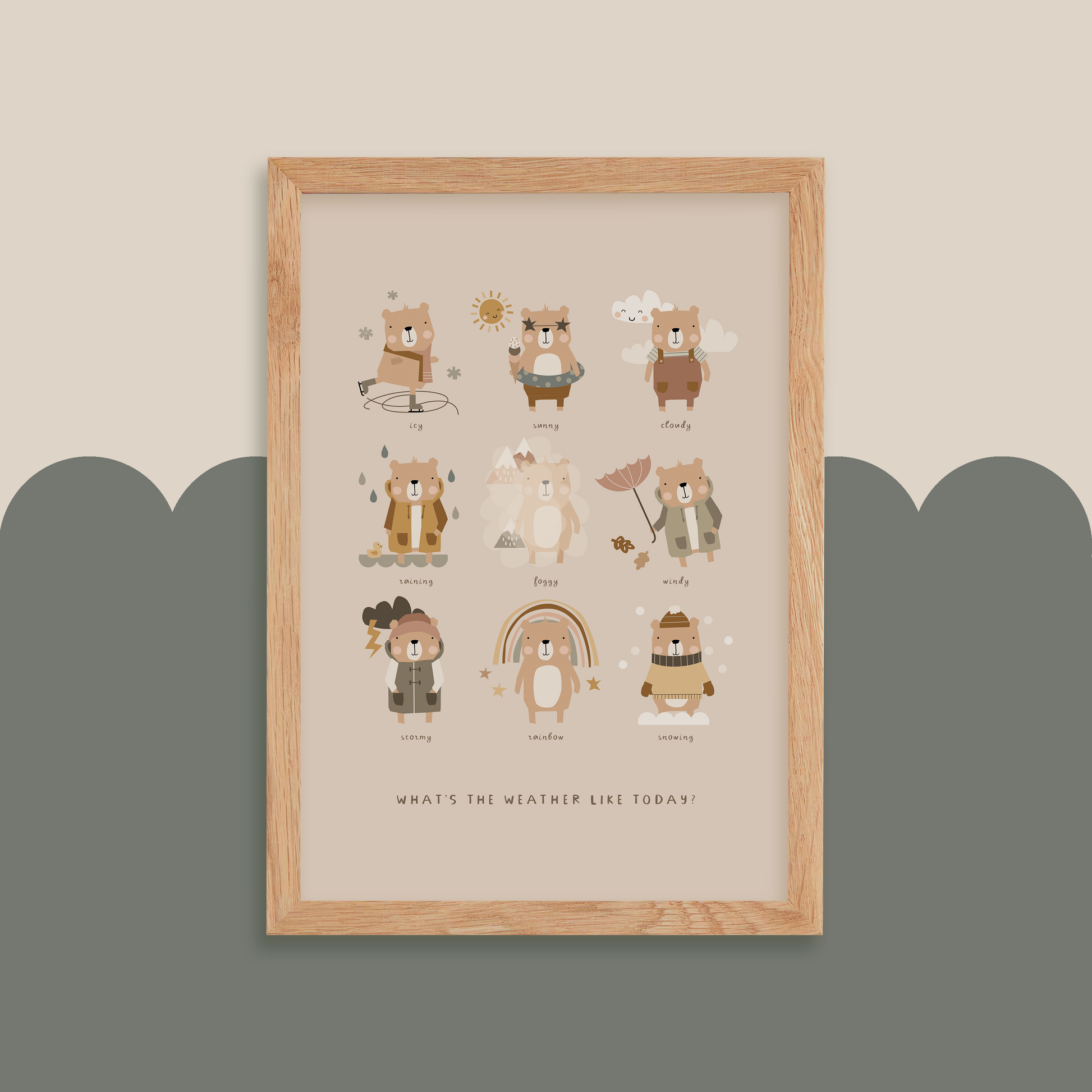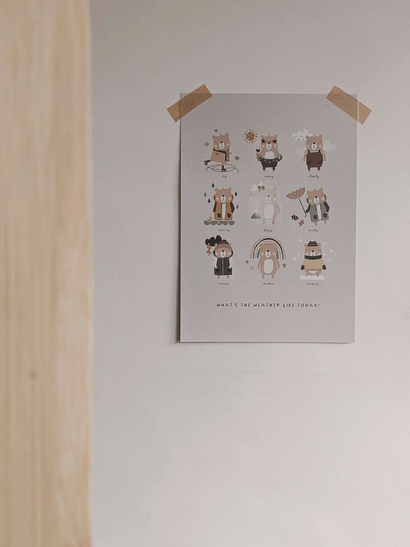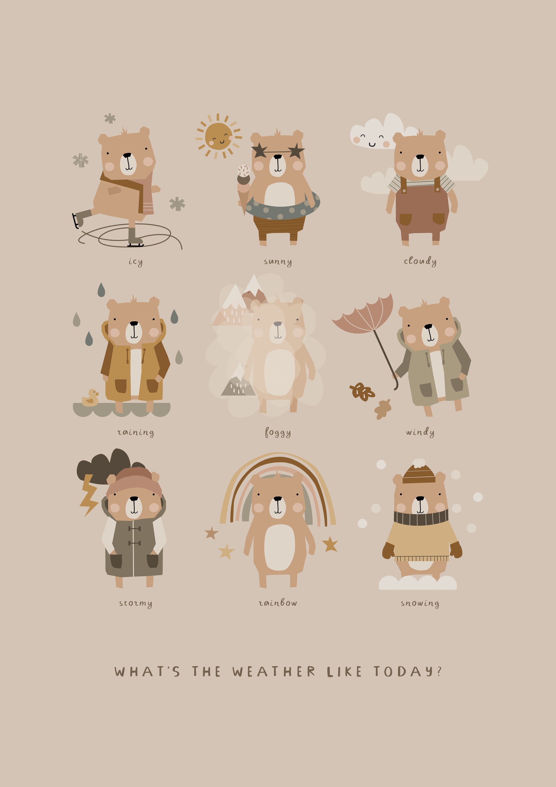 Your little one will learn about the different types of weather with the playful bear illustrations on this educational print. Use as part of your morning routine and ask your little ones to tell you what the weather's like outside! Great for learning about seasonal changes.