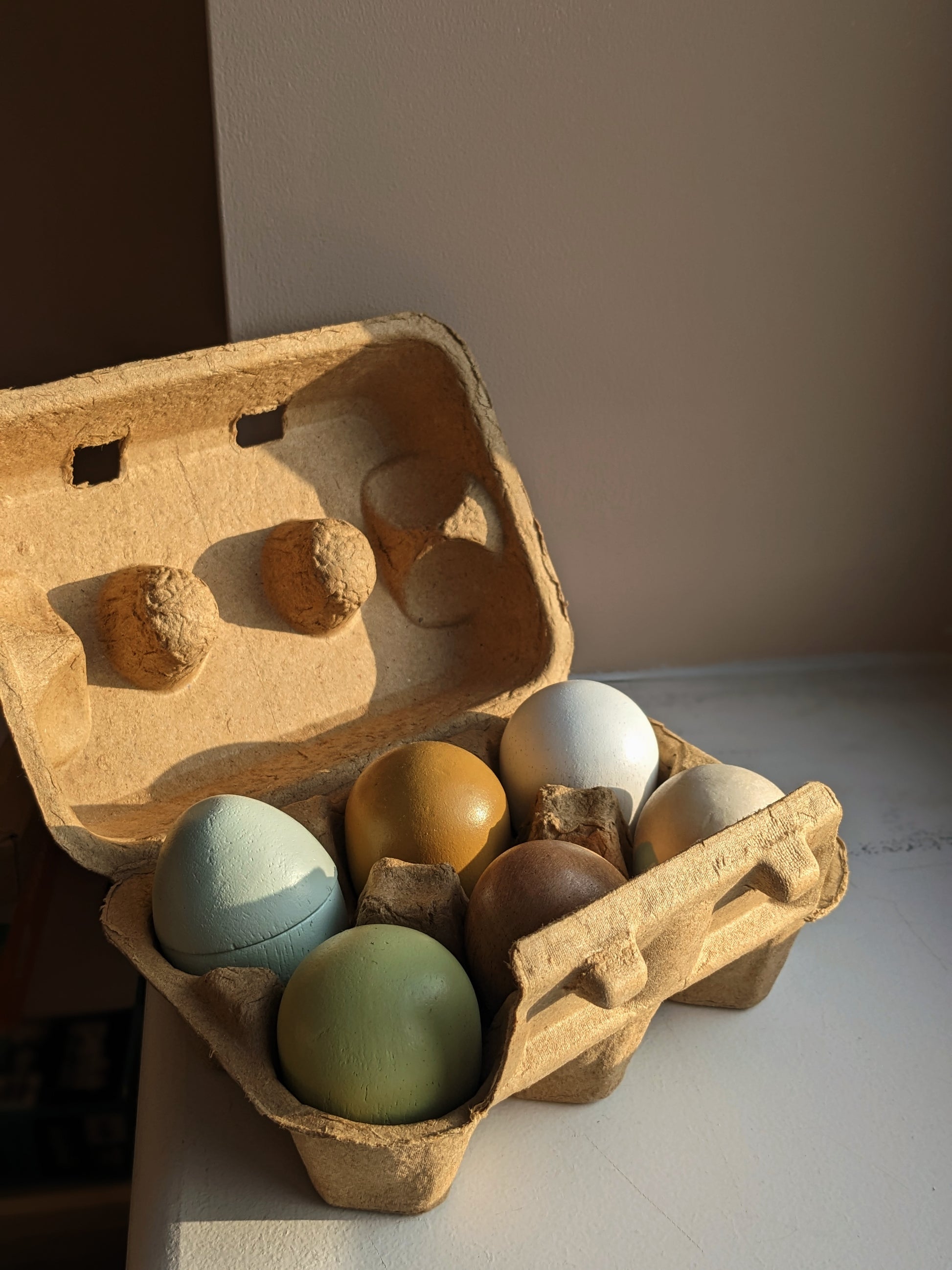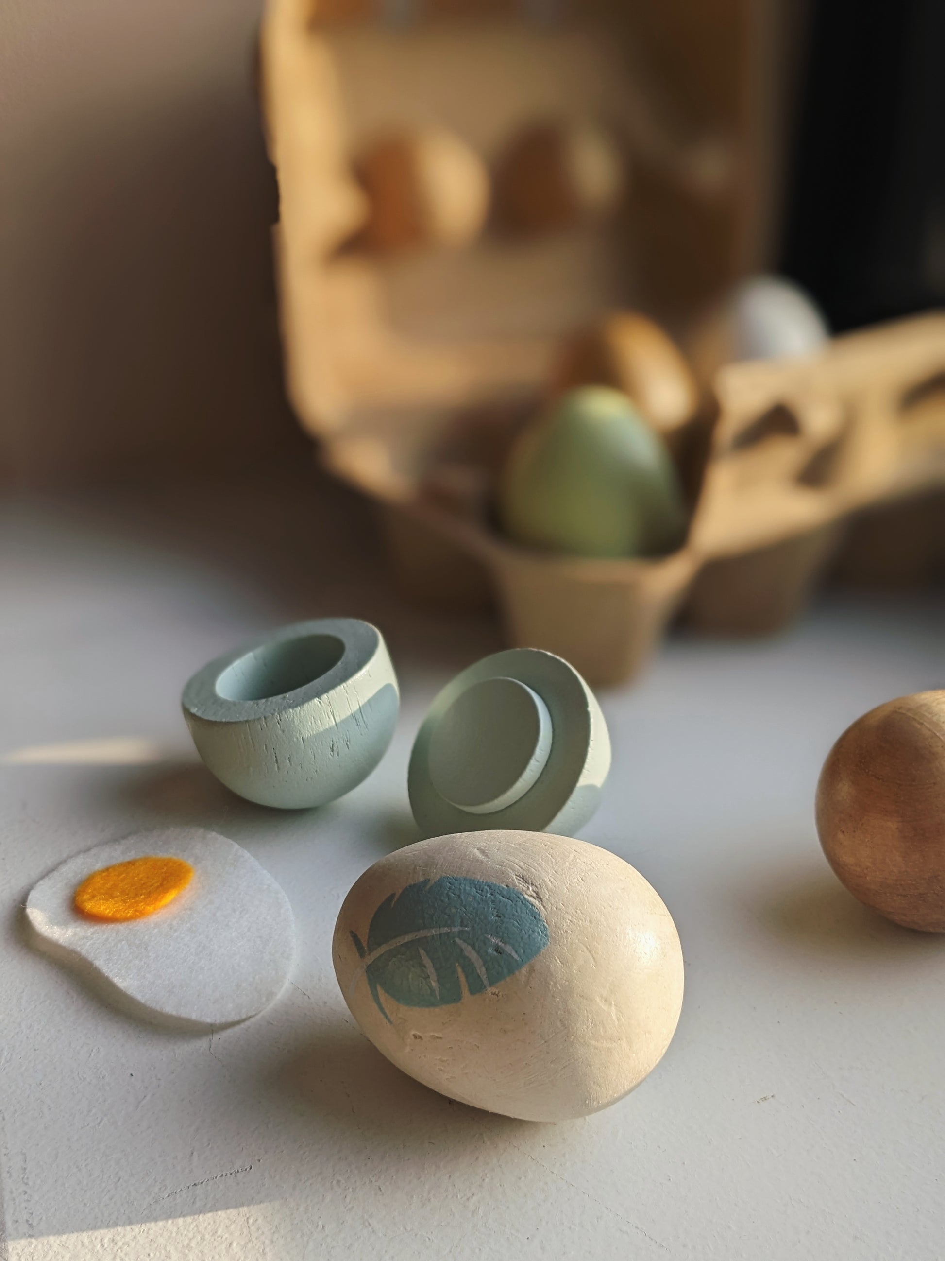 An authentic egg box that contains 6 gorgeous solid eggs. 3 are natural wood and 3 are painted in realistic egg colours. One of the eggs comes apart to reveal a felt egg, and another has a small feather painted on the side. Made from sustainable rubberwood, coloured with soft, non-toxic colours for a contemporary style.