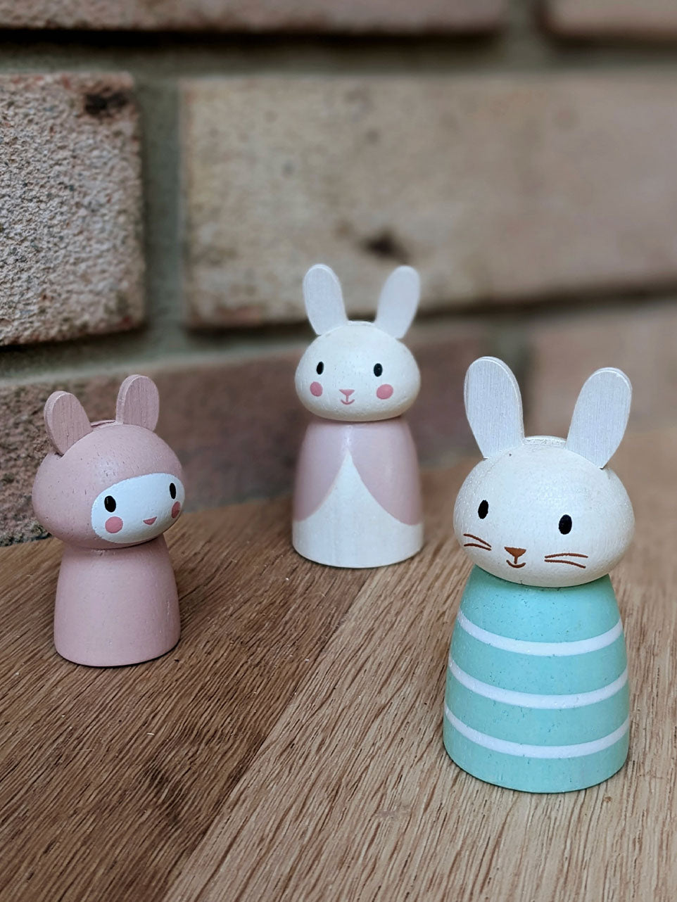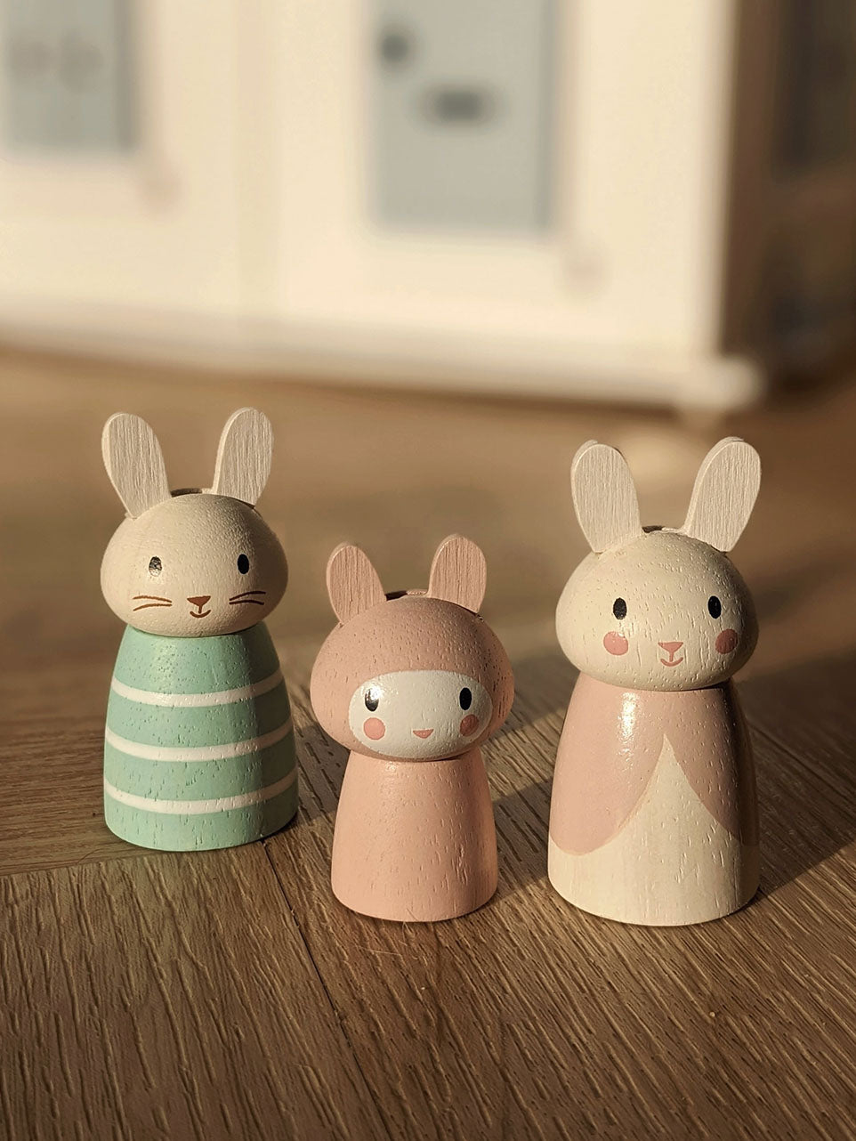 A perfect wooden bunny family with Dotty the mum, Benny the dad and Pip the baby, all finished in stylish colours with their names on the bottom. Ready to add to any dolls house set or open ended play set. Made from sustainable rubberwood and coloured with soft, non-toxic colours for a contemporary style.