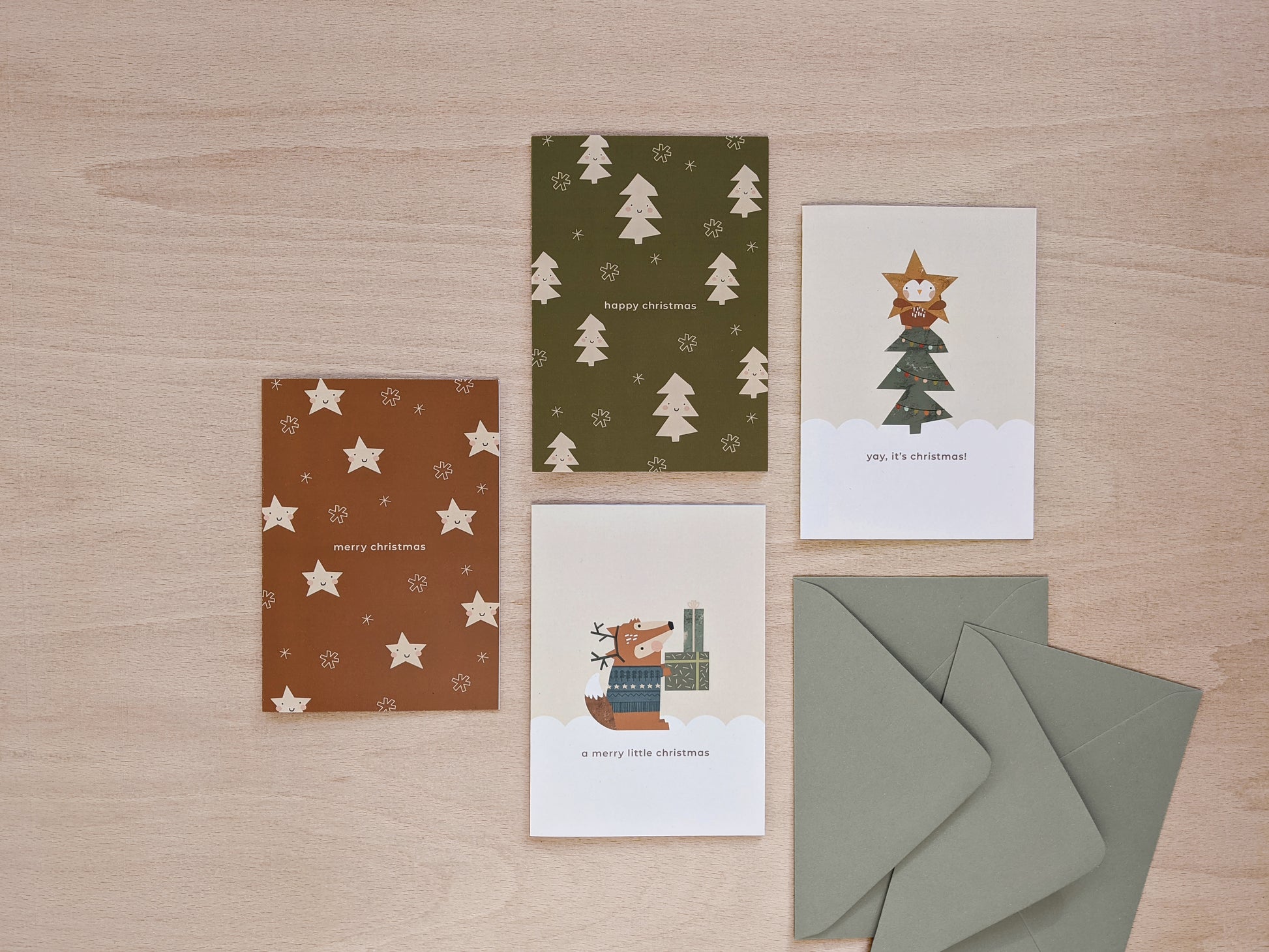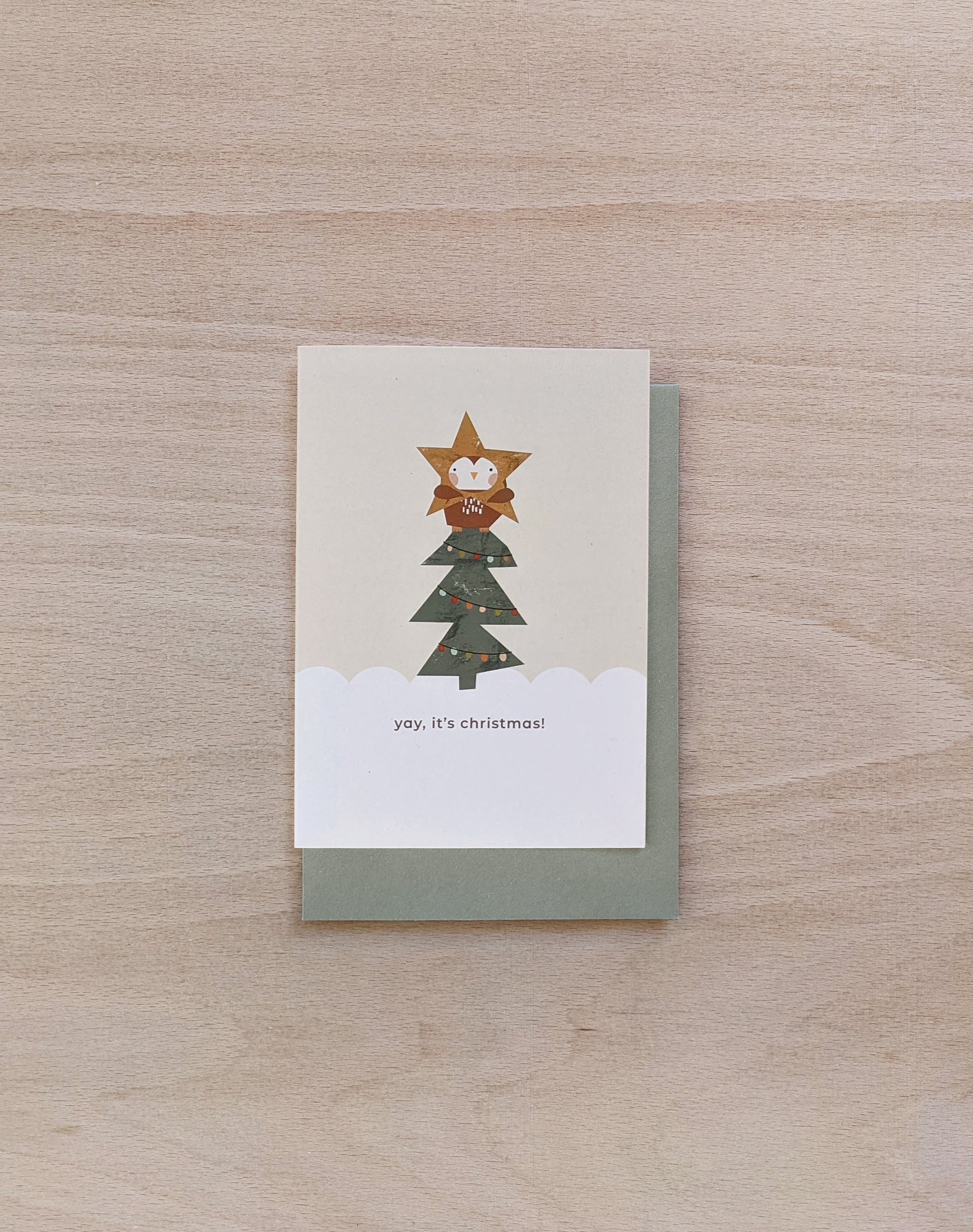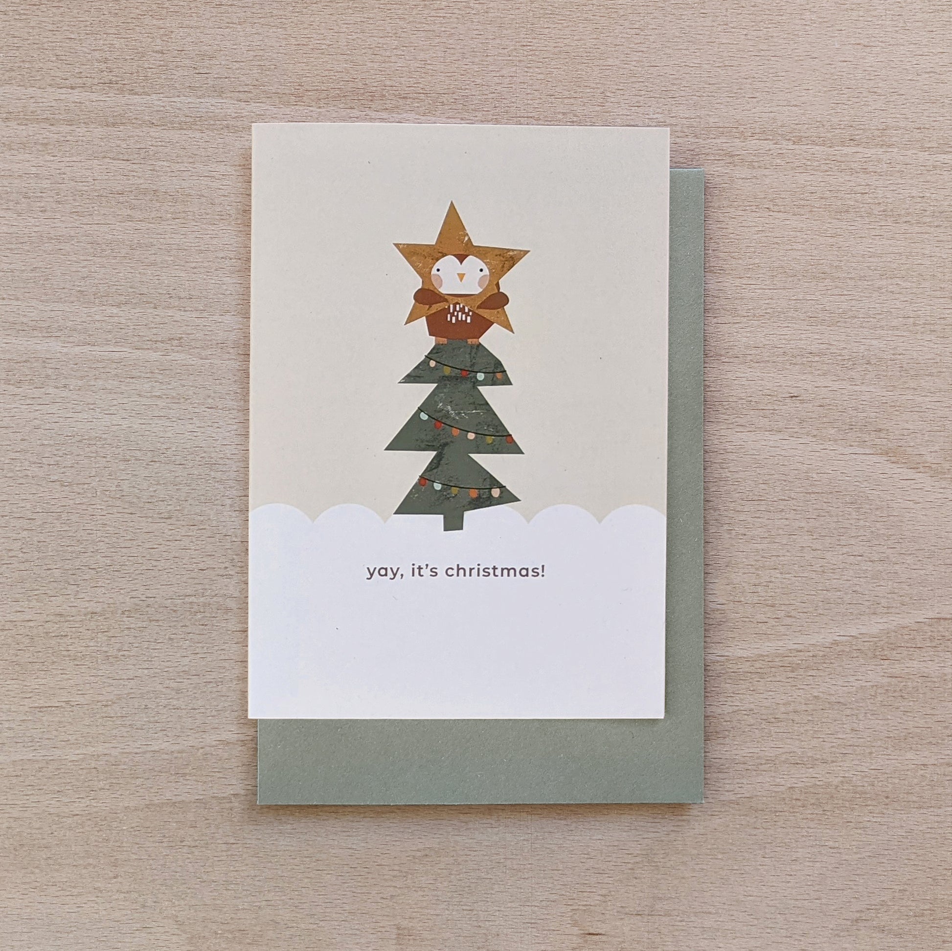 - Whats included: 1 x festive owl card with text 'yay, it's christmas!', 1 x sage green envelope